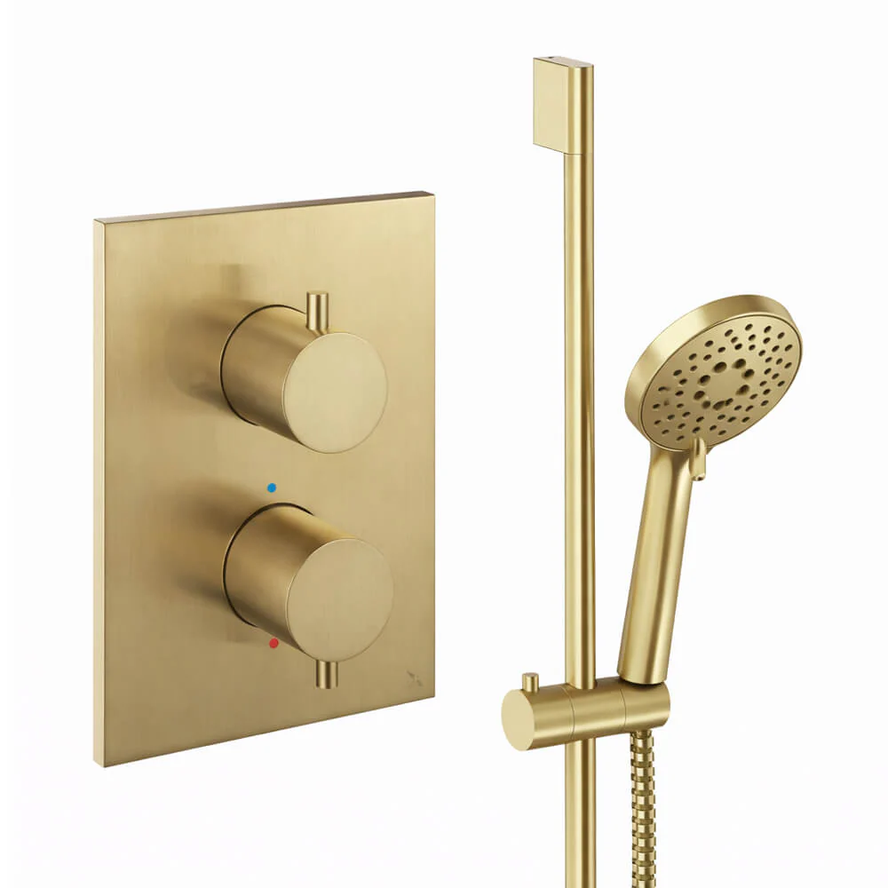 The Crosswater Crossbox Shower Set 2 is a modern and practical showering solution designed to deliver reliable performance and precise temperature control in contemporary bathrooms. Manufactured from durable brass and ABS materials, this shower set combines strong construction with sleek modern styling. It features one outlet and two knob handles for smooth and accurate control of water temperature and flow. The system operates with a minimum water pressure of 1 bar and a maximum of 5 bar, making it suitable for high water pressure systems and ensuring a consistent and comfortable showering experience. Part of the Crosswater Crossbox collection, this shower set includes a trim set, valve body, slide rail, round hand shower with hose and a wall outlet. The thermostatic valve provides dependable temperature stability and is designed for 100 percent safety, helping to protect users from sudden temperature fluctuations or scalding. It complies with EN 1111:2017 standards and is a KIWA and WRAS approved product, confirming its high quality and reliable performance. The internal headwork features a thermo cartridge and flow controls that allow precise management of water temperature and flow. An integrated Easy-Switch thermostatic module provides added installation flexibility by allowing quick and simple flow reversal if the water feeds are connected the wrong way during plumbing.
