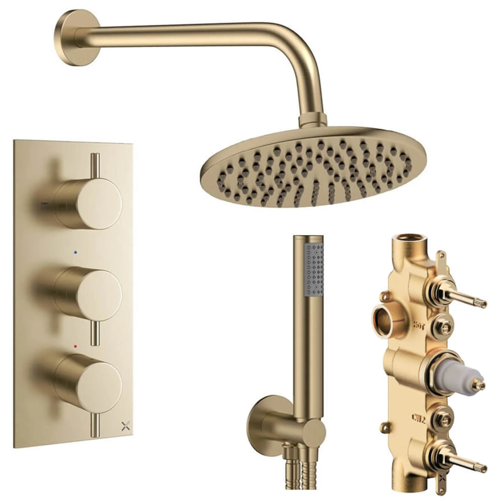 - Shower Set Includes - 2 Outlet 3 Handle Concealed Thermostatic Shower Valve Portrait, Round Contemporary 2 Control Concealed Trim Set, Wall Outlet with Hose and Handset Bracket, Contemporary Round Fixed Shower Head and Contemporary 330mm Projection Wall Mounted Shower Arm