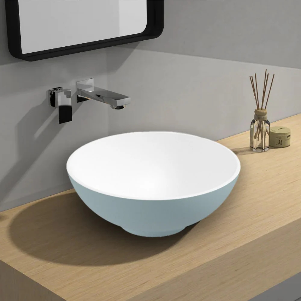 Elegant and bold - the stylish dual-tone Skal countertop basin sits proudly on your selected countertop vanity unit. The organic shapes and ultra-sleek profile are achieved by Solid Surface, a natural resin material, with a silky-smooth touch and matt finish. Skal showcases a modern, cutting-edge aesthetic. Skal's spectrum of shades adds a touch of sophistication to your bathroom. Complete your look with a contemporary Tall Freestanding or Wall Mounted Basin Mixer Tap.